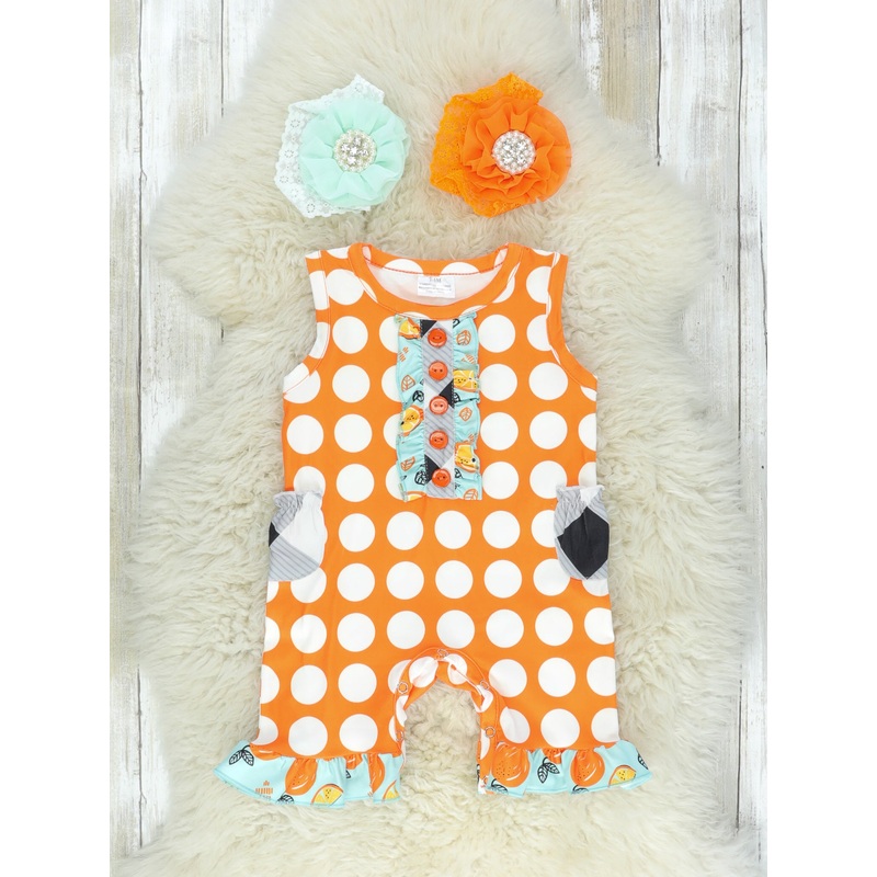The large orange polka dots make this sister set perfect for Summer! We love how the buffalo plaid pockets add a little extra "WOW" to this romper! Shop the matching outfit here.Fits true to size.Polyester.Accessories sold separately.Add $6.99 for the head