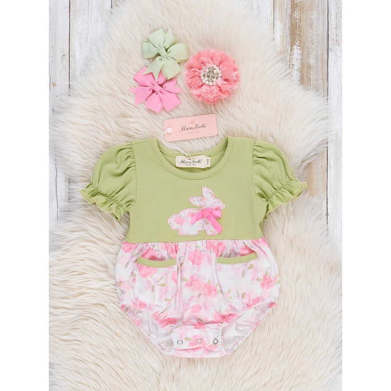 This adorable bubble features an embroidered floral bunny design, perfect for Easter celebrations. The sister set option allows for charming matching outfits. Have a hoppy Easter with this cute and fun ruffle dress byMarie Nicole Clothing.Snap buttons. Fit